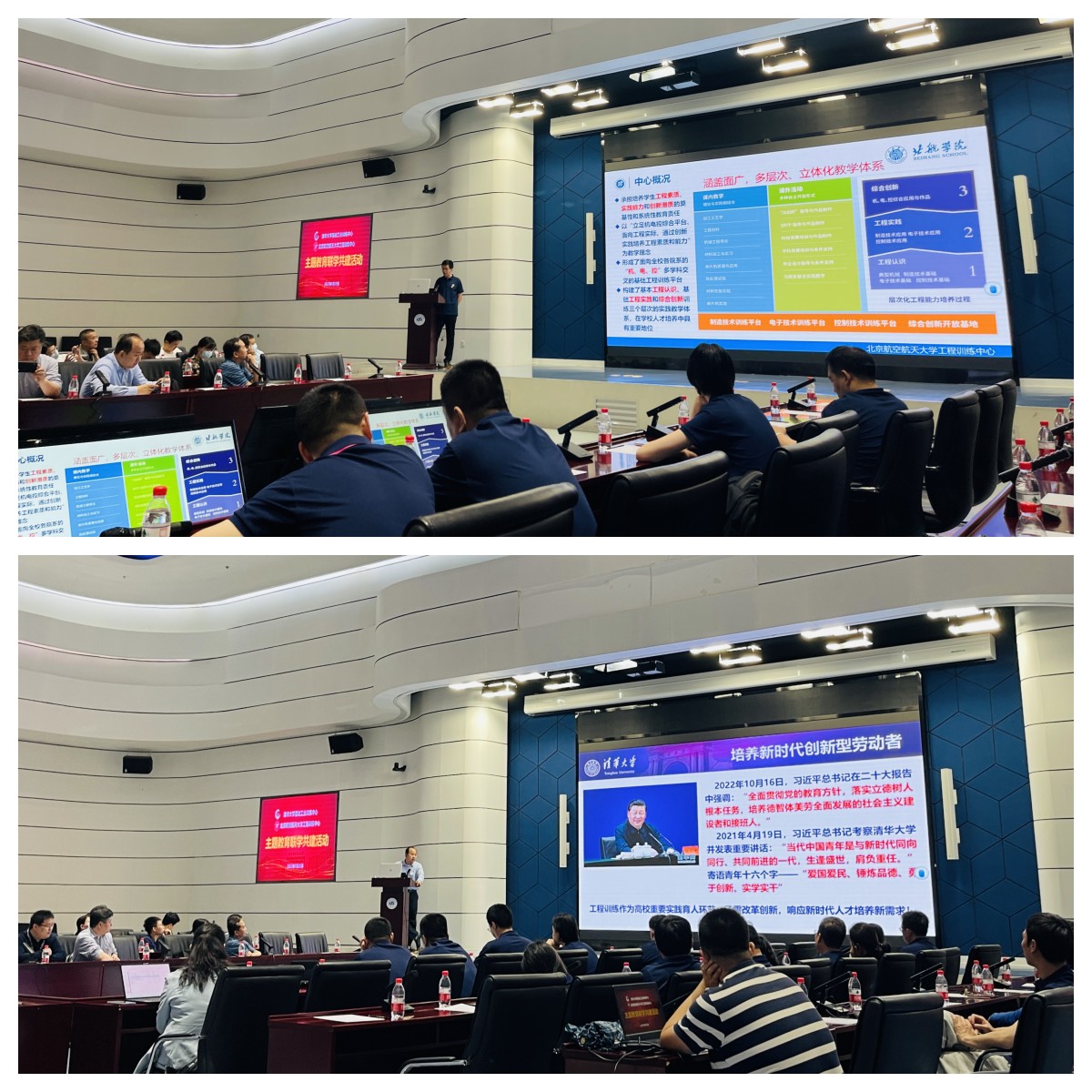 参观结束后,与会人员共同前往报告厅进行汇报交流。北航工程训练中心教师党支部书记、中心副主任齐海涛介绍了北航工程训练中心的基本情况和工程训练中心教师党支部相关情况,表示期待双方能够开展更多交流合作。清华基础工业训练中心副主任杨建新介绍了清华基础工业训练中心工程训练课程体系建设的基本情况,表示作为国际领先的工程实践与创新教育中心有责任和义务传承工匠精神,弘扬创客文化,助力梦想实现。
