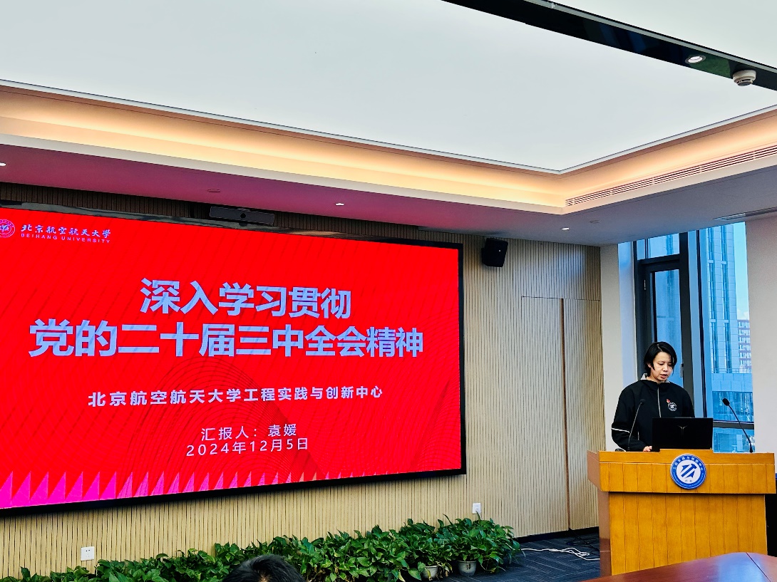 其次,袁媛作了以《深入学习贯彻党的二十届三中全会精神》为题的党课学习,她从基本概况、公报内容和学习思考三个方面对党的二十届三中全会精神进行了宣讲,并分享了中心教师党支部深刻领会全会精神、在学思践悟中汲取奋进力量的做法与展望。