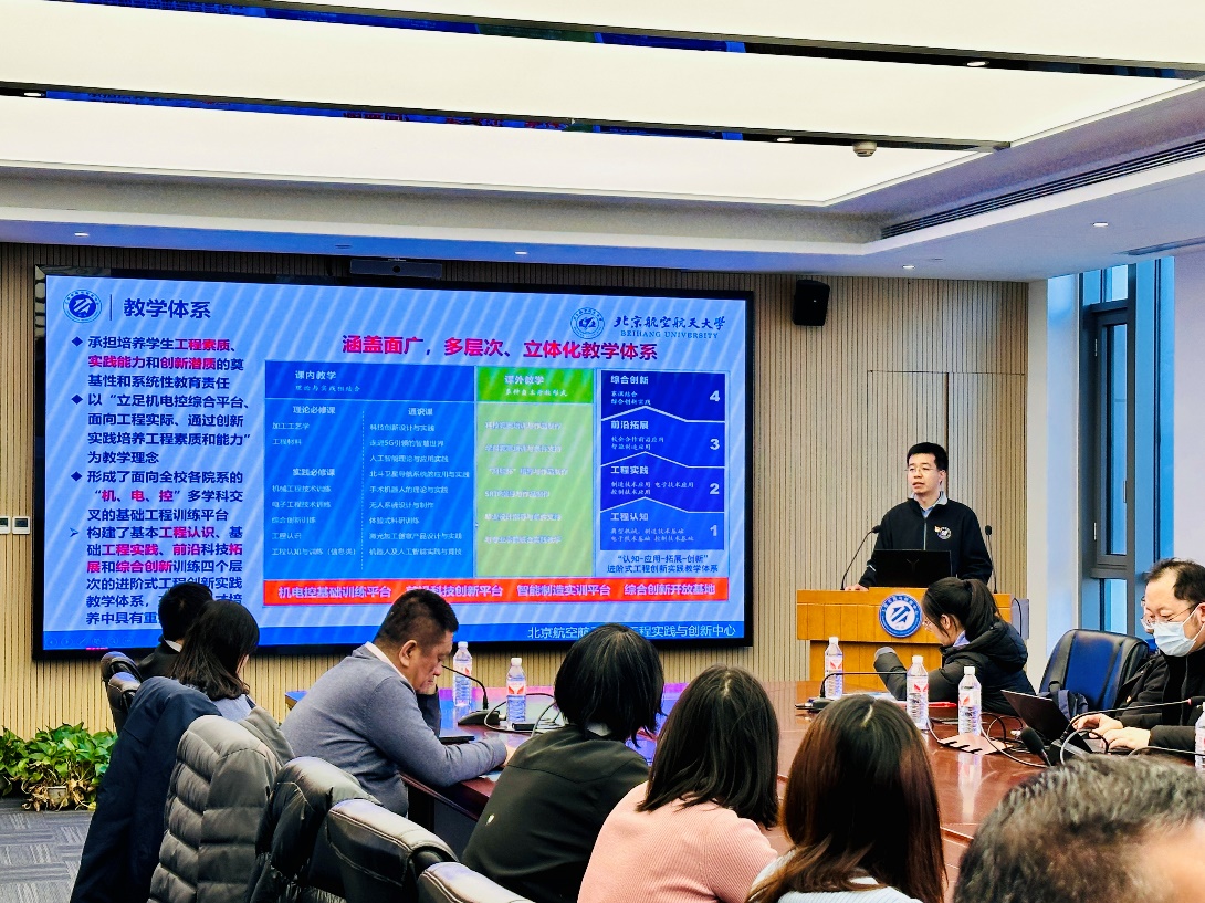 首先,齐海涛介绍了北航工程实践与创新中心概况、组织架构、党的建设、教学体系、开设课程、科创育人等方面的基本情况。吕庆功介绍了北科工程训练中心概况、金工实习基地、电子实习基地、机器人工程实践基地、虚拟仿真平台的基本情况以及雄安新校区工程实践创新基地的规划。