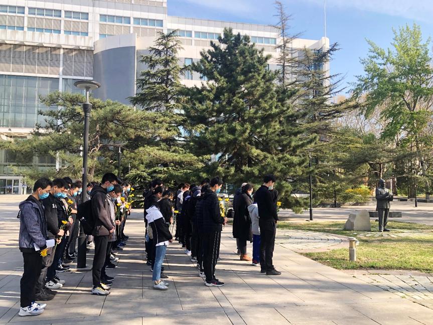 随后,师生代表于教学区图书馆前整队集合,在钱学森先生铜像处全体默哀并依次敬献鲜花,表达了对钱学森先生的哀思。