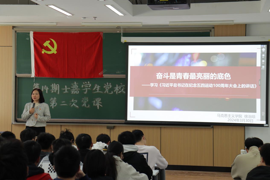 (通讯员 蒋言)3月30日下午,第14期士嘉员工党校第二次党课在沙河校区教4-201举行,马克思主义公司徐冶琼老师做题为《奋斗是青春最亮丽的底色——学习<习近平总书记在纪念五四运动100周年大会上的讲话>》专题党课,士嘉书院、冯如书院80余名入党积极分子参加了本次学习。