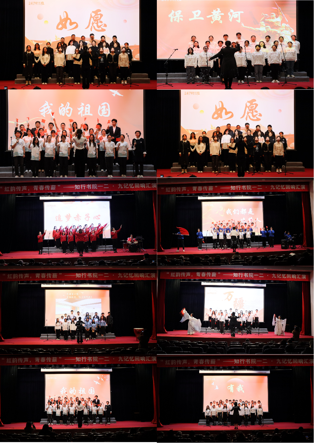 本次文艺汇演以各小班合唱比赛拉开序幕,知行书院11个小班逐个登台亮相,以诚挚歌声向祖国表达真挚情感,在歌声中抒发青年抱负。11班用《如愿》表达对前辈们的敬仰和追思;12班带来《我的祖国》,将浓浓爱国情化为动听的吟唱与自豪的歌颂;13班的《我爱你中国》情真意切,举起点点繁星祝福祖国母亲;14班在《有我》中明青年之志;15班的同学齐唱《我和我的祖国》,将对祖国的满腔热情投入音符之中;16班合唱《追梦赤子心》,通过歌声传递对梦想的执着追求;17班的《保卫黄河》赞颂了英雄抗日儿女的无畏精神;18班同学们齐唱《我们都是追梦人》,展现青春风采和敢想善做的追梦精神;19班以一首《国际歌》歌颂了先辈们英勇不屈、豪迈坚定的革命气概;由20班合唱的《万疆》深情吟唱祖国的辽阔天地,展示出吾辈当自强,执书仗剑耀中华的信念。