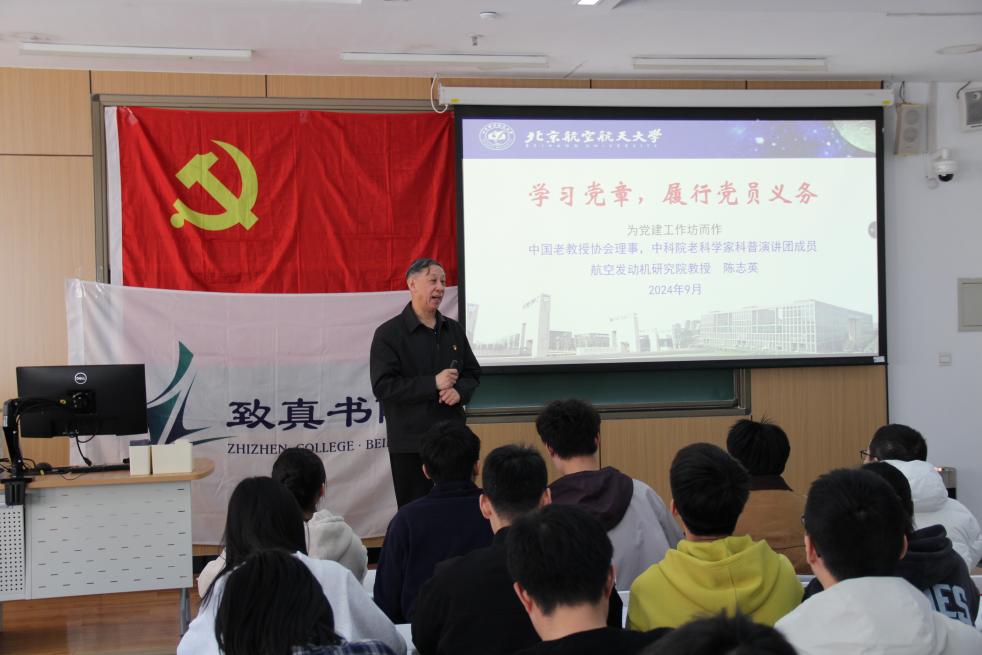 (通讯员 李新越 谭袁宁至)2025年3月16日下午14:00,致真书院第十三期星火党建工作坊第一次党课在J3-101教室成功召开。bv伟德中国官方网站航空发动机研究院教授、中国老教授协会理事、中科院老科学家科普演讲团成员陈志英应邀担任主讲人,以“学习党章,履行党员义务”为主题,为入党积极分子带来一堂深刻的思想教育课。