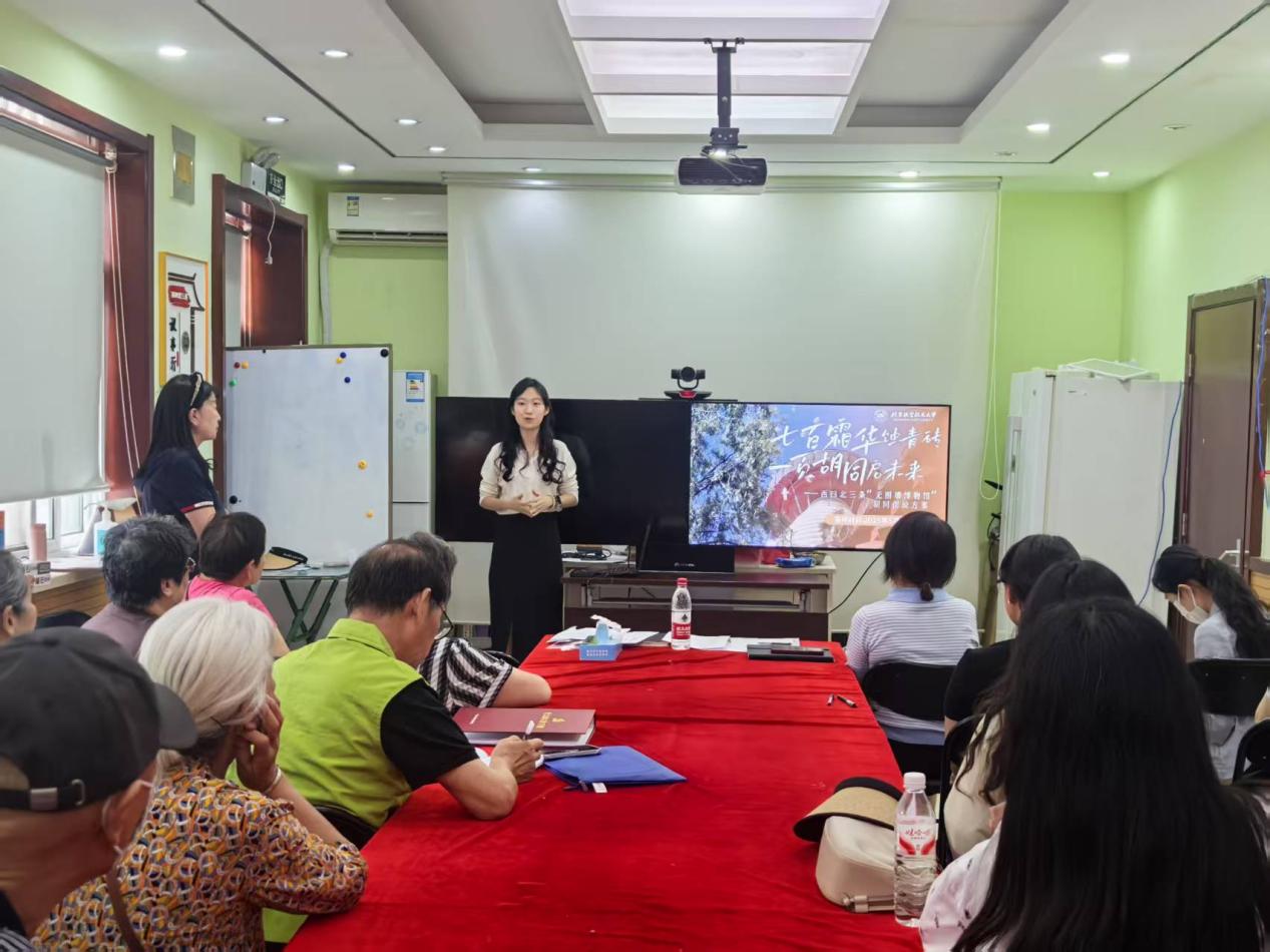 西四北三条胡同拥有七百余年历史,知行书院员工代表石佳禾分享了团队同学合作策划的胡同文化传承设计方案《青砖上的谜题:以胡同七百年历史撬动未来》,提出以“无围墙博物馆”为载体,通过实景解谜、文创开发与社区联动三大模块,构建“文化体验+社会治理”的创新模式,以青年视角为中华优秀传统文化传承提供了新思路。