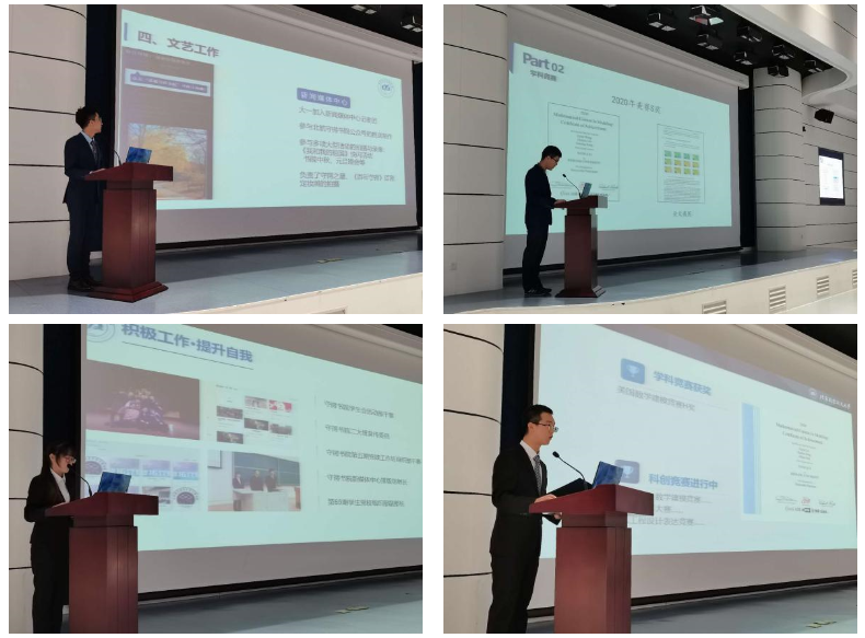 答辩的同学就学业水平、学科竞赛、科技实践、社会工作、文体活动、党建工作几方面做了自我阐述。参与的竞赛以及活动包括:美国老员工数学建模竞赛,冯如杯员工创意大赛,党建工作坊,朝阳支教活动,梦拓活动,守锷百年话剧,朝阳支教活动,小桔灯志愿服务,童年一课线上支教,数据分析,发表论文。他们合理协调自己的时间,以实际行动给大一一年交上了一份完美的答卷。