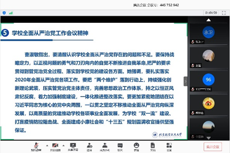 最后,齐海涛传达了公司2020年全面从严治党工作会议精神,强调要统筹推进2020年中心各项工作任务的落实,要持续加强党的政治建设,凝心聚力做好疫情防控和线上教学相关工作。