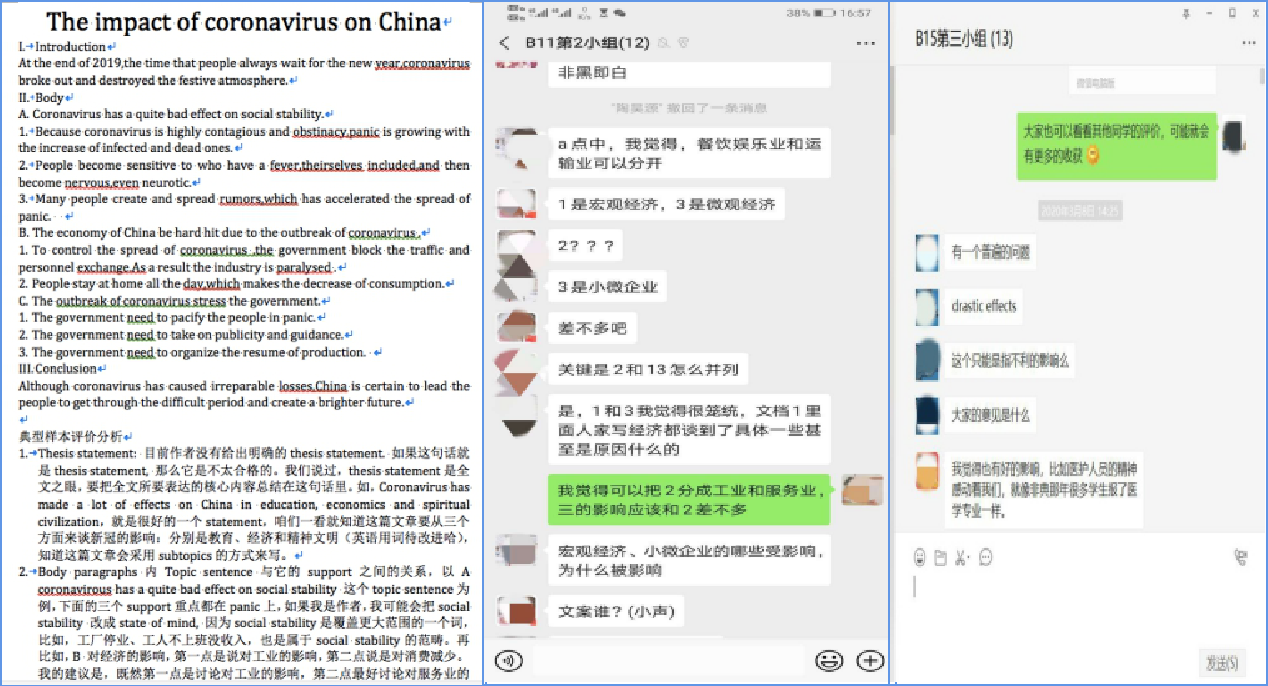 另外,在目前网络教学情况下,充分发挥每种线上技术优势,实现优势互补。比如U校园学习平台为员工提供了听说数字课程;IWrite写作平台助力员工语言问题的修改,方便了员工互评和教师评价;Zoom会议平台方便师生交流和生生交流;微信课程群可以发布各种信息,微信小组群便于开展小范围深入讨论。