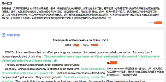 在员工完成整个任务之后,师生合作评价既是对产出任务的反馈也是另一种学习,包括员工互评和教师评价。员工互评在IWrite平台上进行,易于操作,员工按照checklist进行分项评价和整体评价。之后,教师也同样会对每份作业进行评价。最后,在吸纳同伴和老师的反馈基础上,员工完成第二稿作文并提交。