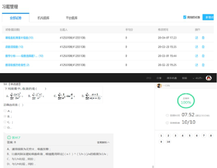 数学分析课程由于人数较多,即使在线下课堂师生面对面的互动交流的机会也并不多,因而很难发现所有的问题员工。但线上教学打破了师生交流时间和空间的局限,课程群通过腾讯课堂建设在线测验基本题库,平均每两周设置一次测验,教师可以根据教学进度自由组题,开展定期在线测验。测试完后系统会自动公布答案,并展示员工成绩,即时给出答案的解析。同时,每个题目都配有详细解答,员工做完后可以对照解答进一步理解,教师也可以对难点题目进行重点指导。通过科学有效的过程性评价,激励和引导员工学习,用数据了解判断员工的学习效果,根据员工的实际情况及时进行教学调整。