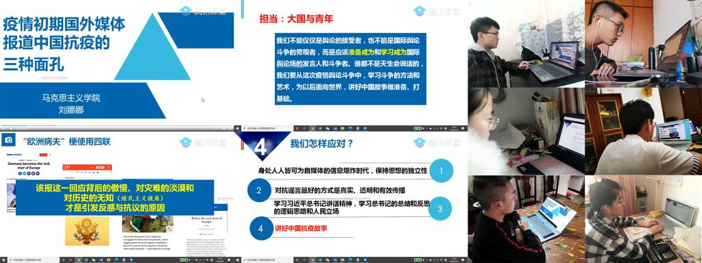在本期联合党校春季班开班仪式上,冯如书院本科员工党支部和冯如党建工作坊依托“大国战疫”系列专题思政课,开展线上集中学习。课程由马克思主义公司副教授刘娜娜老师讲授“大国战疫”系列专题思政课第一讲,主题为《疫情初期国外媒体报道中国抗疫的三种面孔》。课程充分展示抗击疫情的国际比较,从理论维度分析原因,明确了对待外媒的谣言和舆论诱导所应当持有的正确态度,并且树立了作为大国青年的信念与担当,作为疫情防控时期书院员工“学习日”和入党积极分子培养的补充环节,助力员工党员和入党积极分子增强“四个意识”、坚定“四个自信”、做到“两个维护”。