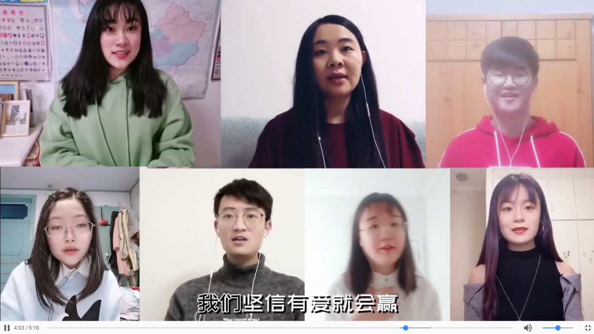 青春战疫,坚信有爱就会赢。为了向前线战士致敬,提高同学们的信心,致真书院面向全体员工,发出“云”合唱的号召,选择了由中国文艺工作者们共同创作的一首以抗击疫情为主题的歌曲《坚信爱会赢》,由工作人员对辅导员和同学们的歌唱成果完成MV剪辑。
