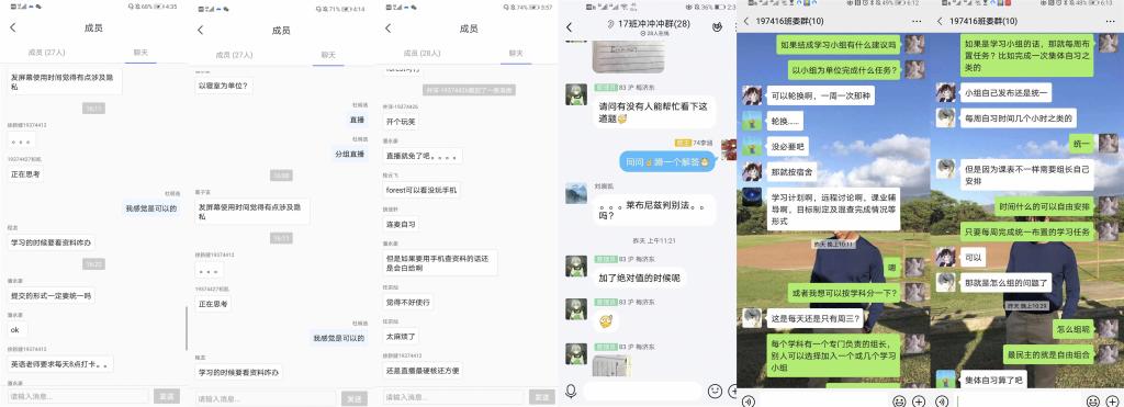 各团支部根据分团委新学期部署要求,结合当前线上“教”与“学”实际情况,“凝聚青春正能量,众志成城抗疫情”为主题,在团课后召开团员大会,开展班风学情民主研讨,组织制定线上学习的“一班一策“。全体团员群策群力,精心讨论设计集体攻略,做到“一支部一特色”“全员参与,全员覆盖”,引导全体员工“相互帮助,携手守望”。197411团支部以宿舍为单位结组,成立学习小组开展互帮互助。197418团支部以集体打卡塑造班级学风,以小组交流开展个性探索,通过“点面结合”的形式,相互监督促进集体良好学风。197421团支部制定答疑计划和资源共享计划,班团干部带头执行。197426团支部制定“早晚计划”,早起晨读打卡,晚上利用Forest习惯养成软件,以建立房间集体“种树”的形式“云”监督全体晚自习。