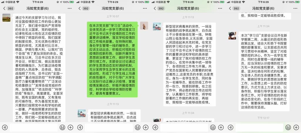 党支部根据《员工专组中期工作方案》,提前着手策划,充分讨论方案,借助“学习强国”平台和公司理论中心组学习材料,加强理论修养,增强党性认识,提高政治站位,筑牢疫情防控思想防线,确保思想不松懈,精神不放松。全体党员通过微信线上会议形式,集体学习讨论习近平总书记关于疫情防控工作讲话精神,及中央、上级部门、公司党委关于疫情防控工作的相关要求,对照方案部署书院近期重点工作,力求从严从实落实到位,增强了打赢疫情防控阻击战的信心和决心。各位党员在支部讨论平台积极发表学习感想,分享心得体会。
