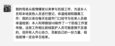 虽然疫情在前,二大班的同学们仍积极通过线上交流的形式开展了各项主题团日相关活动。从同学对疫情自由交流看法,班委的防疫分享与对实时疫情的详细介绍,二大班同学表现出对疫情的高度重视和严加防控。本次主题团日活动也完美开展,将疫情防控的重要性传递给每一名员工,展现出二大班同学对疫情防控工作的高度执行,是对每一位为疫情不懈奋斗的前线人员的致敬。榜样的力量引领我们前行,向前线工作人员致敬的同时,作为老员工的我们,更要严格居家隔离,坚守底线,不传谣不信谣不造谣,共同抗击疫情。