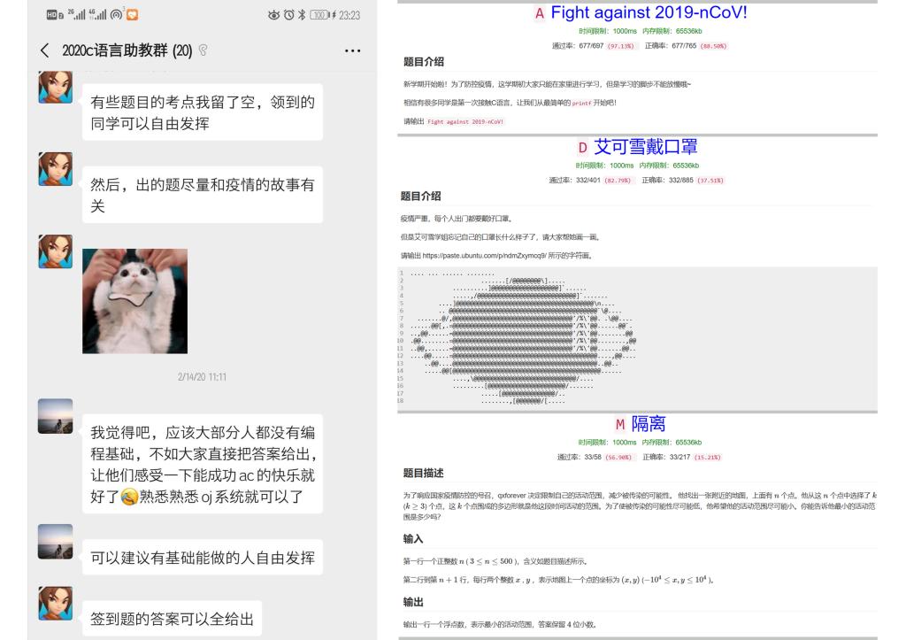 为了鼓励员工了解C语言,也让老师充分掌握员工的基础,程序设计课程群策划了“湖北加油防疫专题赛暨2019级航类脸熟赛”,并在老师自主研发的Online Judge在线检测系统上开放。系统开放后,700多位同学参赛,不少同学开始向助教请教问题,一问一答,收获知识与鼓励。虽然本课程尚未开课,但师生都已经渐入角色,老师和助教们已经开始通过查看员工代码分析那些从分数上无法体现的问题,在教学及辅导中开展针对性的讲解。