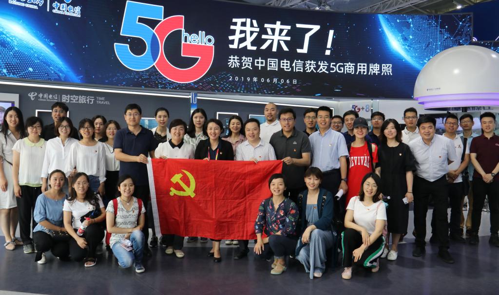 参观结束后,bv伟德机关党支部与北京电信校园市场党支部全体党员在中国电信5G展馆前合影留念。