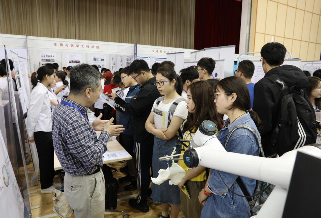 专业公司的展位前,同学们纷纷向老师提问“这个专业的优势是什么?”“有哪些特色的专业课?”“专业未来的发展方向是什么?”等问题,而老师们则结合专业科技前沿、科技实物展品和生活实例等对同学们的问题进行生动形象的说明。