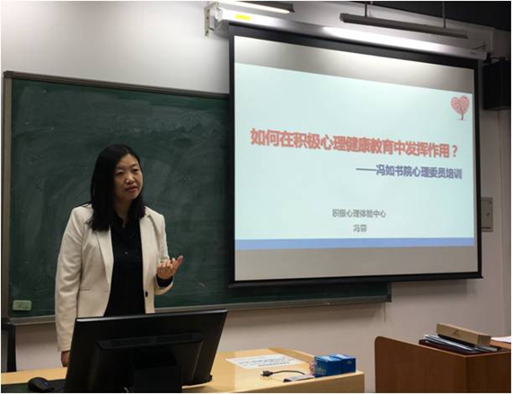 培训开始,冯蓉老师首先从“积极心理”的概念和起源讲起,为各位心理委员阐述了积极心理学与传统心理咨询的重大区别,强调积极心理学更加关注健康心理的塑造,而不是病态心理的治疗。接着,冯老师向大家展示了冯如书院员工心理调查大数据分析结果,让同学们意识到自己身边人的心理健康状态,在工作中做到有的放矢。 在团体辅导技能培训环节,冯蓉老师带领同学们进行了“优势卡片”团体辅导技能培训,教授给大家适宜在小班中组织的积极心理建设活动的操作步骤与注意事项。最后,冯蓉老师为心理委员们讲解了发现心理问题后的处理步骤和因对措施,嘱托大家要做好心理健康工作的第一道防线。冯老师的培训逻辑清晰、内容丰富、贴合实际,引起了在场心理委员们的强烈共鸣,整场培训过程气氛热烈,反响较好,取得了预期的培训效果。