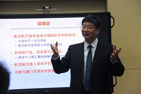 最后,杨超经理展望了未来的航空航天技术,一张张充满科幻美感的未来航天器概念图极大的激发了员工对于未来空天事业发展的兴趣。更大,更快,更小,智能化,无人化……种种航空航天未来的发展方向通过一个个详实的案例展现出来。杨超经理深情讲到:“航空航天越来越成为强国的专利和标志,是科学与工程汇聚的、永恒的行业,是人类和平和发展的关键基石之一。”他向师生介绍了北航在航空航天发展过程做出的贡献,展示了北航深厚的工科基础;也表达了对澳门大学的深厚文化底蕴的钦佩,希望北航与澳门大学开展更加深入的合作交流,优势互补,为实现伟大中国梦共同奋斗。