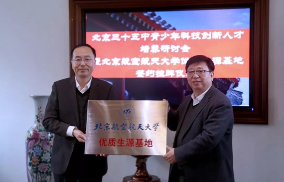 10月25日上午,北航人才招聘处、北京招生组一行走进北京市第三十五中学,双方举行北航“优质生源基地”合作协议签约及挂牌仪式。北航人才招聘处处长马进喜、副处长张青竹,北京招生组冯如书院执行经理高静,航空科学与工程公司教授关志东,三十五中董事长朱建民、书记孔燕、副董事长黄鹏等共同参加了座谈会及签约授牌仪式。