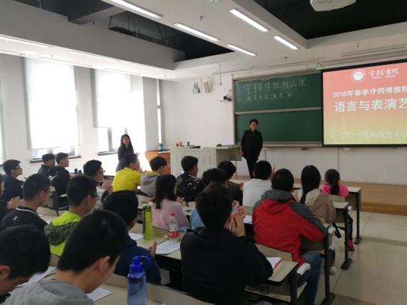 4月15日上午,守锷博雅精品课《语言与表演艺术》第一讲在J3-201拉开帷幕。孟昭宜教授通过幽默风趣的语言、声情并茂的演示、独具特色的讲解,让同学们享受了轻松愉快的课堂并体会了语言与表演的无限魅力。