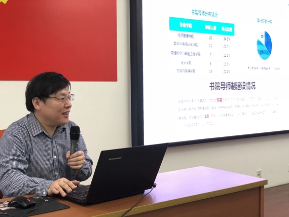 学业总导师曹晋滨教授向大家总结了2017年导学活动的开展情况。据统计,秋季学期书院共举办导学活动204场,其中线上80场,线下124场;导学小组最多活动次数为15次,累计时长超过40小时。数据表明,员工对导学活动整体满意度高达90%以上,对导师工作质量及辅导水平给予了充分肯定。据员工意见反馈结果显示,98.8%员工认为导学活动对学业成绩的提高有效,99.4%员工认为导学活动对未来专业选择有帮助。在导学活动中,大家更多倾向于在学术引导、思想引领、学业帮扶方面得到帮助。曹晋滨教授还对完善书院导师制建设提出了建议和要求。他指出,导学活动要符合导学大纲的基本要求,学业导师应充分发挥自身优势及特色,依托科研提升计划,结合“冯如杯”等竞赛,打造精品化导学活动。