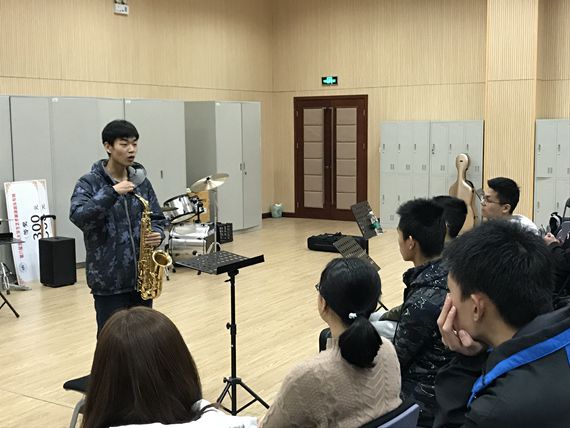 白雪飞学长为同学们详细介绍了萨克斯的类型、发声方式和乐器起源,使同学们对萨克斯有了初步的了解。 随后,他带领同学们组装萨克斯,并教导同学们进行发声练习,并学习控制声音的音色和响度。最后他详细讲解了萨克斯的一些缺点和萨克斯的练习方法,并亲自为同学们展示了萨克斯的两种技巧。