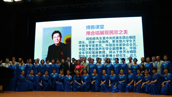 阎伯政教授是中央民族乐团合唱团团长,国家一级指挥,教育部老员工艺术教育专家委员,中国音乐家协会会员,中国少数民族声乐学会副理事长,中国音乐公司客座教授,师从于世界合唱联盟协会主席萨尔斯曼的博士研究生。他不仅在艺术上有很高的成就,在历史人文方面也有独到的见解,对中国民族歌曲的演变与特色的分析诠释深入浅出,令人印象深刻。