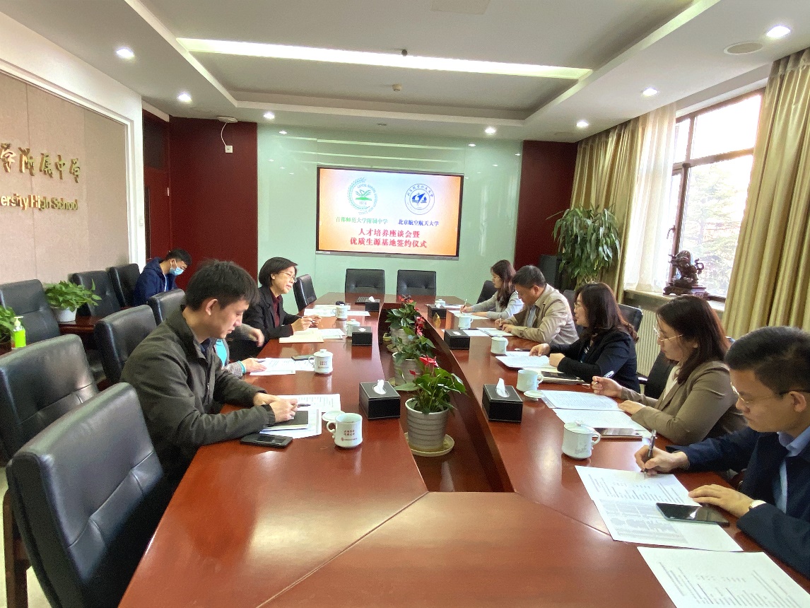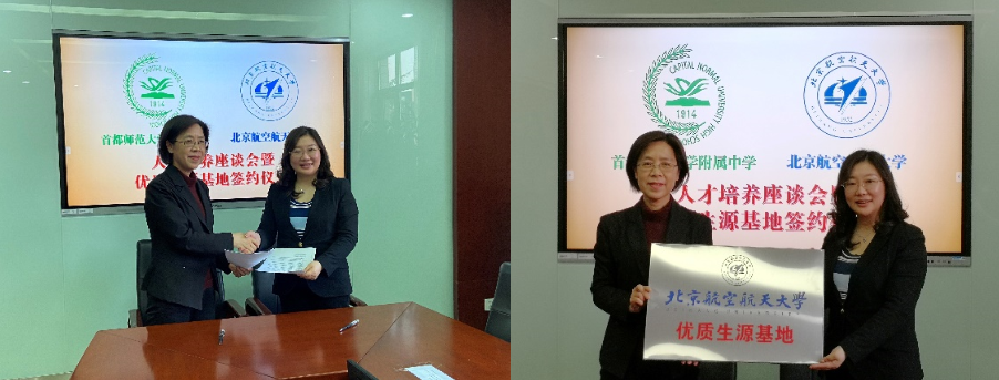 北航人才招聘处处长邓怡、士嘉书院执行经理王雷华、公司人才招聘处和北京招生组相关人员同首师大附中董事长沈杰、董事长助理任海霞及相关教师进行了座谈交流。邓怡首先介绍了北航近年来在人才选拔和培养工作中的情况,并分享了公司今年在招生专业设置以及强基计划等方面的一些调整,期待未来能够吸引更多首师大附中的优秀学子报考北航。沈杰介绍了公司的发展历程以及突出特色,阐述了公司一直以来传承的育人理念,并表示了对于双方开展协同育人合作的高度支持。随后,双方举行了“优质生源基地”协议签约及挂牌仪式。