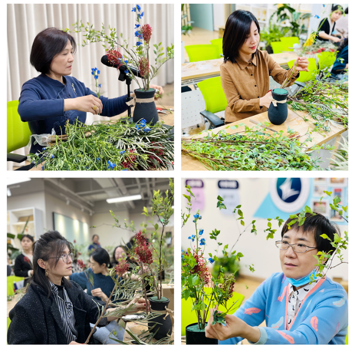 活动在轻松愉快的氛围中展开,花艺老师现场讲解了中国传统插花艺术的历史、中式花器、插花造型、色彩应用及鲜花保养常识等内容。女同志们在花艺老师的讲解下,结合各自手中的花材特点和审美情趣,从鲜花的取材、剪叶、构图、布局开始,不断的进行尝试和实践,忙得不亦乐乎。绚烂飘逸的银桦、清新雅致的小飞燕、纯洁优雅的高山羊齿、蓬勃向上的手球花,经过近两小时的搭配扦插,一盆盆错落有致、生机盎然、个性十足的中国传统插花作品展现在大家眼前,令人赏心悦目。欣赏着通过自己双手亲自制作出来的作品,大家的脸上洋溢着喜悦欢快的笑容与花朵相互交融。
