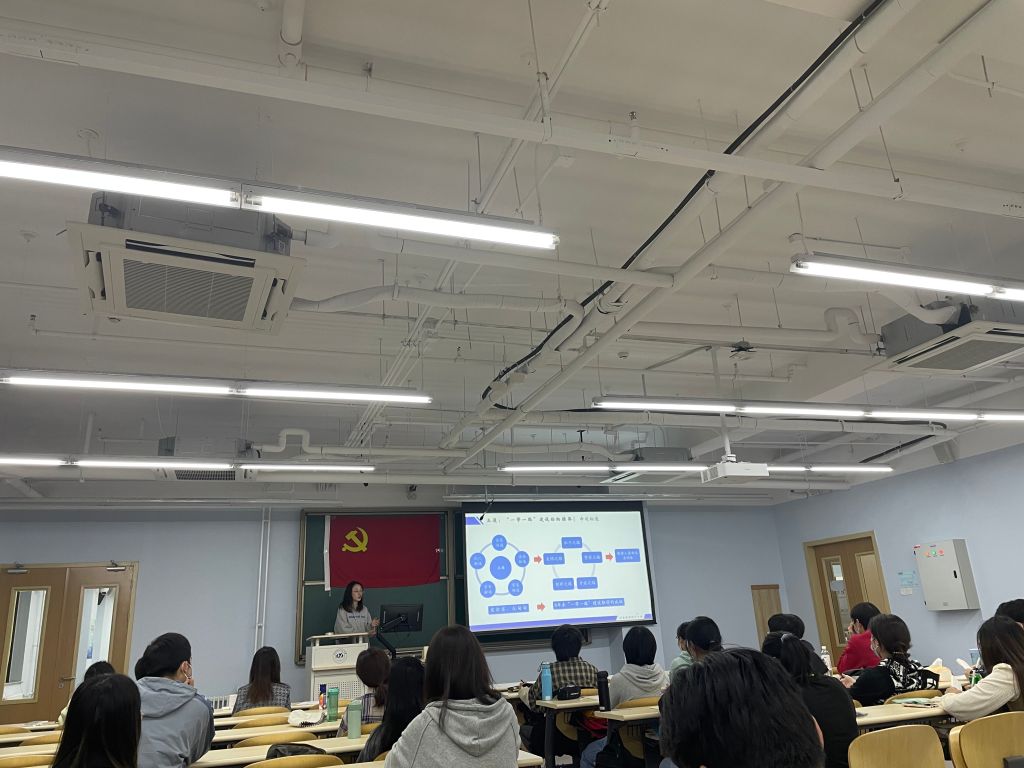 小组展示环节结束后,杨可心老师开展《一带一路——构建人类命运共同体的伟大探索和实践》主题党课。杨可心老师从“一带一路”国际大背景出发,强调推进共建丝绸之路经济带和21世纪海上丝绸之路是党中央主动应对国际形势深刻变化和我国发展面临的新形势、推进对外开放与国际合作作出的重大决策。“一带一路”建设是一项系统工程,要坚持共商、共建、共享原则,积极推进沿线国家发展战略的相互对接。