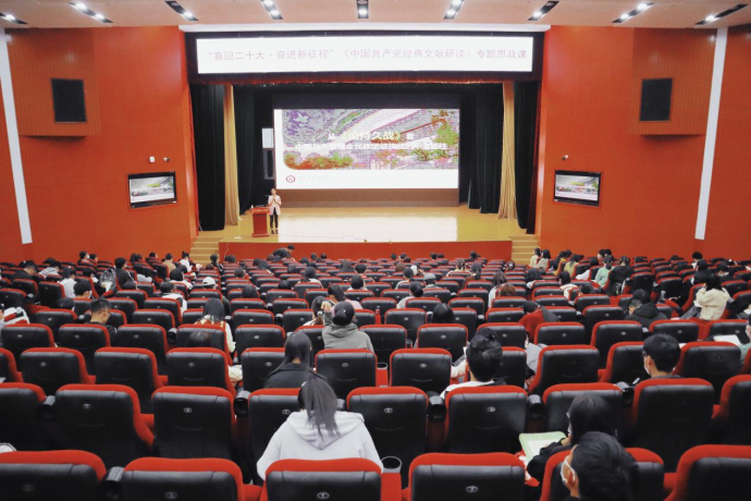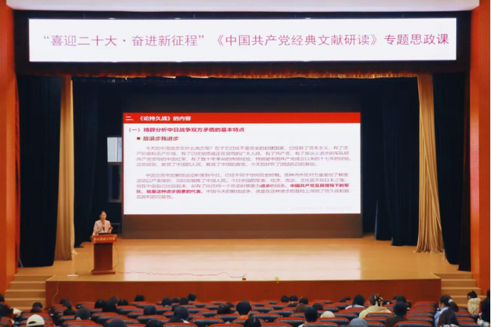 (通讯员 张成昌 周睿浛)“喜庆二十大·奋进新征程”,在党的二十大胜利召开和北航建校70周年之际,知行书院积极推进赤心思政工作室建设,开展《中国共产党经典文献研读》专题思政课。10月15日下午,知行书院邀请马克思主义公司吴东姣老师开展《中国共产党经典文献研读》专题思政课第二讲《从〈论持久战〉看中国共产党是全民族团结抗战的中流砥柱》,引导入党分子研读中国共产党经典文献,学习体悟伟大抗战精神,激励入党积极分子做有理想、敢担当、肯吃苦、肯奋斗的新时代好青年。知行书院辅导员和赤心党建工作坊200余名学员参加本次党课学习。