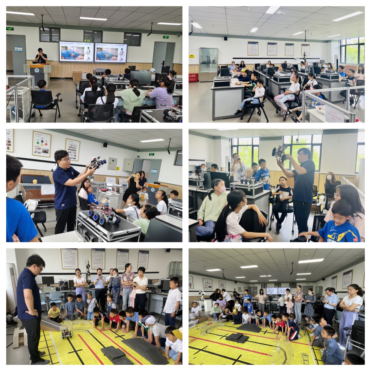 在机器人创新实验室里,让孩子们简单了解了机器人的发展历史,以及目前国际上最先进的机器人能够实现的各类运动形式,随后简单了解了月球车的结构与各部分的功能,最后让每一位小朋友都动手操作了以月球车为原型的全地形机器人,体验机器人自主巡线、越障、穿洞等过程。
