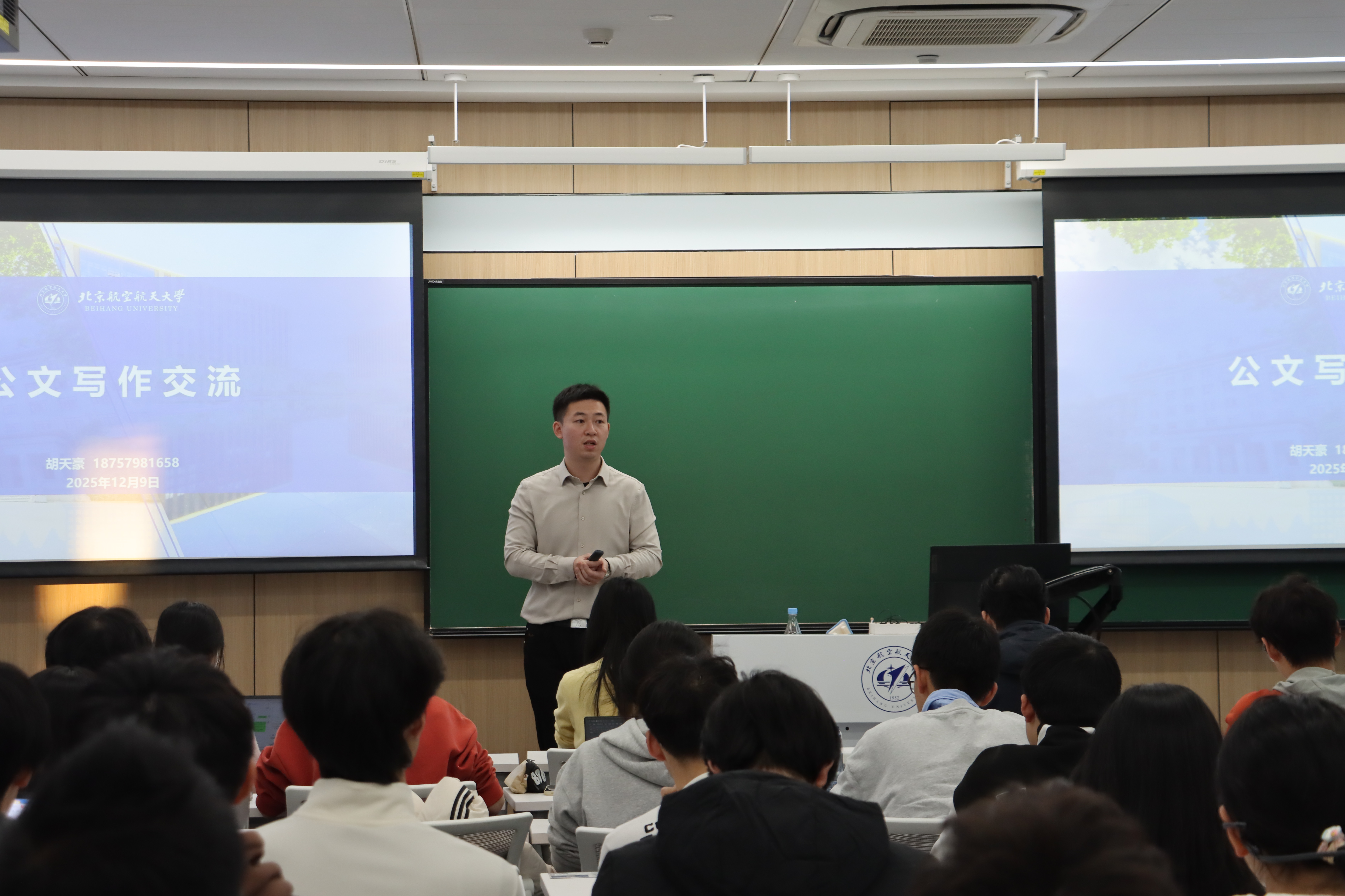 培训中,胡天豪老师从公文的规范性与实用性出发,系统讲解了提升写作质量的四个关键。第一是注重版式规范,他指出整洁、标准的格式是公文专业性和说服力的基础。第二是厘清行文逻辑,胡老师结合bv伟德新闻、通知、总结等不同文体的实例,分析了各自的结构特点,说明写作思路应随文体类型灵活调整。第三是拟定亮眼标题,力求达到简明工整、新颖生动的效果。第四是锤炼有力的字句,他重点介绍了“理论—事例—数据”三句式结构,并通过案例对比,让同学们直观感受不同写法的优劣。