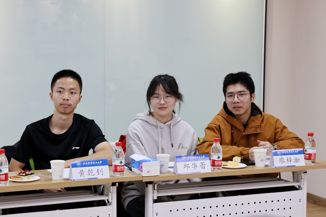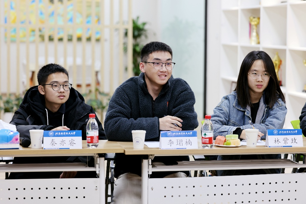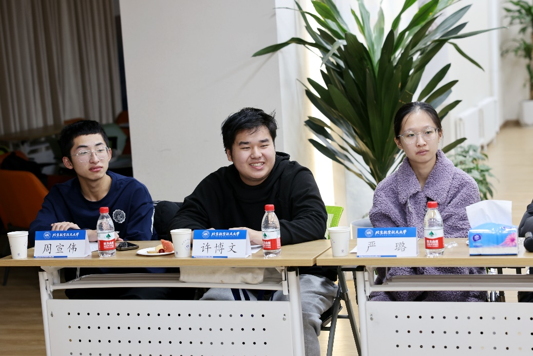 同学们逐一分享了来到北航三个月以来的收获和思考,现场气氛热烈。守锷书院廖梓淞、士嘉书院黄乾钊提出了在大一参加科研实践的期待。冯如书院刘恒、守锷书院邱华蕾希望有更多机会走进各专业公司的实验室,以便在专业选择时明确方向。冯如书院王紫暄谈到,在完成课程大作业的过程中,感到自己在资料查阅、文献综述等方面仍需提升能力,且需要加强与其他同学的交流讨论。传源书院周宣伟分享了参加《启航学堂》的感受,并对进一步开放慕课资源提出了建议。