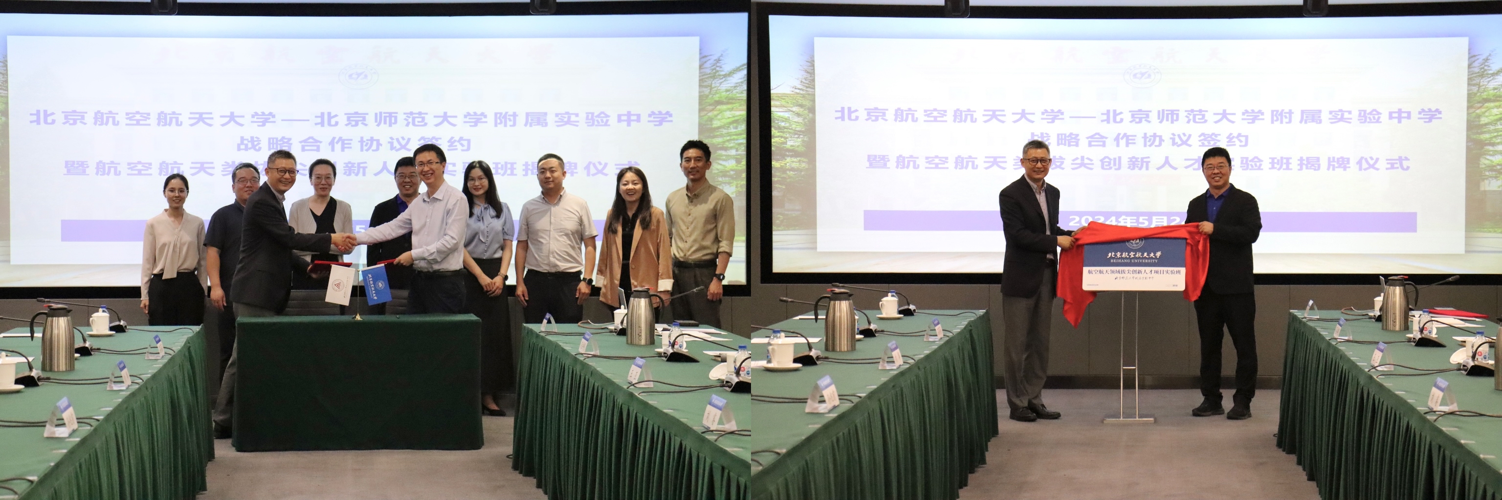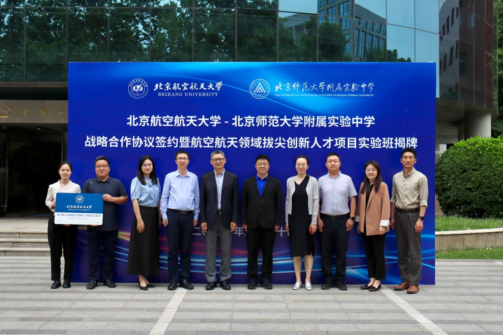 刘虎与孙兆前代表双方公司签署《bv伟德中国官方网站—北京师范大学附属实验中学战略合作协议》,刘睿与孙兆前共同为“bv伟德中国官方网站—北京师范大学附属实验中学创新人才实验班”揭牌。双方本着“优势互补、合作共赢、人才共育”的原则,整合各自优势资源,创新高校与中学联合人才培养模式,将大学航空航天特色和中学人才培养需求有机衔接,在科技创新实践、拔尖创新人才培养等方面深度融合、双向奔赴,为实现拔尖创新人才大-中贯通培养探索新途径新模式,为建设教育强国、科技强国和人才强国作出更多更大的贡献。