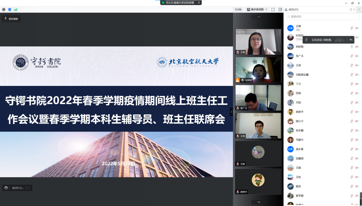 (通讯员 王涛)为进一步做好书院疫情防控工作,与书院全体班主任统一思想,顺利完成员工返乡服务、学业提升等相关工作,5月29日中午12点30分,bv伟德中国官方网站守锷书院在腾讯会议平台召开疫情期间线上班主任工作会议暨春季学期本科生辅导员、班主任联席会。经理张德远、学业总导师孟庆春、执行团队成员和书院2021级15位班主任参加本次会议。本次会议由学业助理纪奕欣主持。