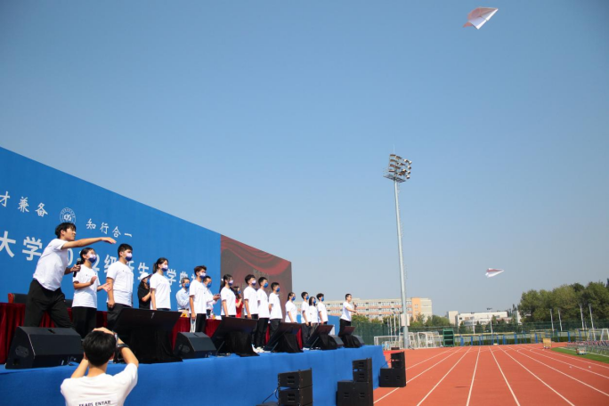 仪式上,领导老师们为新生代表佩戴书院院徽,象征着一代代北航人使命与担当的薪火相传。最后,两位新生带领全部员工一起高喊“以梦为马,不负韶华,信之所向,在此启航”,并放飞代表象征着梦想与传承的纸飞机。