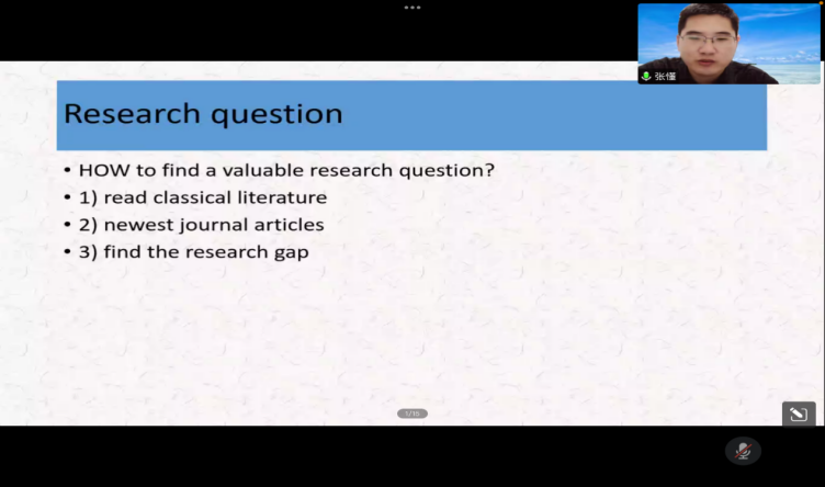 课上,张老师就“如何找好研究课题?”“如何去写学术论文?”两大方面进行详细展开。首先,针对如何选择研究课题,张老师总结了三个方法:第一,要去读本专业领域或研究方向领域内最经典、最核心、最基础的文献,以加深核心基础理解;第二,要去读最新发表的学术期刊论文,以跟进国际研究前沿;第三,要善于发现已有研究的空白,针对现已有的研究,可通过不同视角的转换或是不同研究方法的选择,对其局限所在进行完善与弥补,从而选定研究课题。