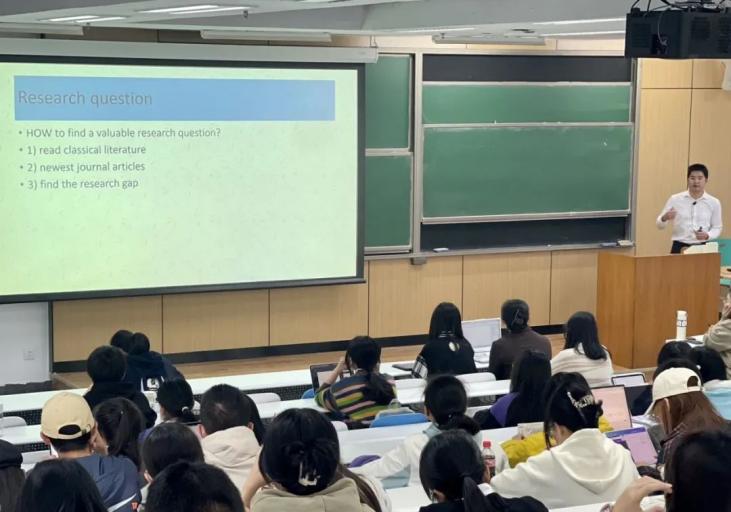 研讨课中,张懂老师围绕如何确定研究选题及撰写英语学术论文展开讲解。张老师首先以自己的论文选题过程为例,介绍确定研究选题的三个步骤,强调加强读文献,在阅读中不断思考的重要性。随后,张老师讲述了学术论文的主要构成部分,并以已发表的英语论文为例,深入剖析了每一部分的写作方法和需要注意的问题。最后,张老师强调撰写学术论文时应当秉持严谨的写作态度,遵循学术规范,通过不断阅读文献,学会运用规范的语言表达。
