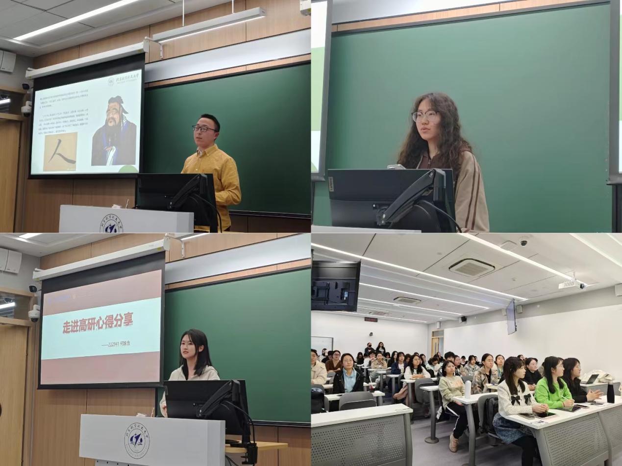 随后,三位高研院学长学姐分享了他们在高研院的学习和生活体验。法学专业的张力恺同学用诗意的语言详细讲述了高研院开设的经典研读课程,分享了因高研院学科融合设置的收获,直观展现了高研院的培养特色与人文气质;行政管理专业的朱欣妍同学结合自己的生活学习体验向同学们介绍了高研院的学习氛围以及高研院所举办的各类活动;经济学专业的何姝含同学就“自己为什么选择高研院”进行了分享,将自己的心路历程娓娓道来,让同学们更身临其境地感受到身为高研院学子的特殊性与责任感。分享结束后,学长学姐们与知行书院同学进行了现场交流,回答同学们的提问,并针对同学们关心的专业分流和保研考研等问题给予解答。