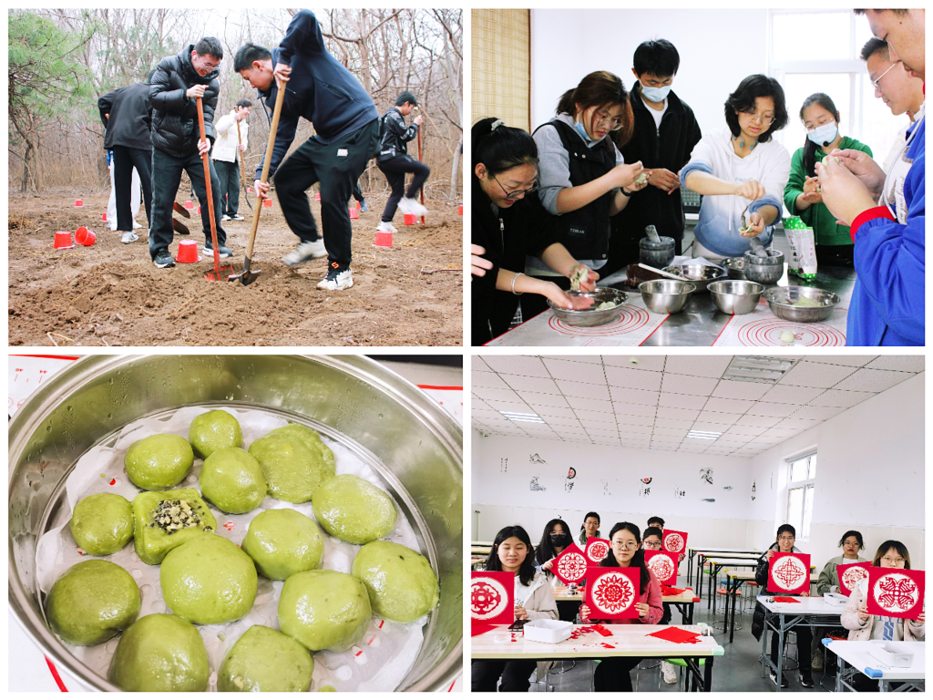 接下来,同学们参加了丰富多彩的劳动实践课程,大家共同植树、剪纸、制作青团。在植树现场,大家三五人一组,挥锹铲土,扶苗培土,踩实浇水,整个过程一丝不苟,各个环节衔接有序、配合默契。经过一番紧张有序、热火朝天的劳动,十几棵柳树挺立起来,萌发盎然生机,再添一线新绿。在制作青团和剪纸的环节中,同学们展现了巧妙的手工技艺和创造力,不仅学习了传统文化,也在动手实践中感受到了劳动的美好。整个活动过程,同学们互相协作,共同完成任务,氛围欢快而和谐。
