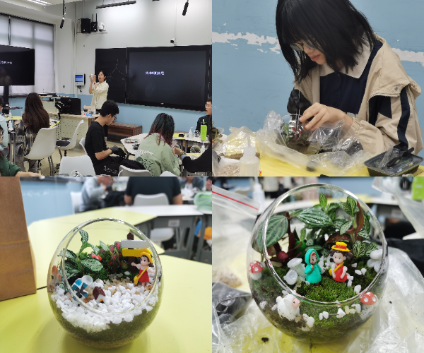 活动现场,同学们手持小型玻璃容器,将各种绿植、小石子、小木屑等材料巧妙地组合在一起,打造出了各种栩栩如生的微缩景观。在活动过程中,同学们深刻体会到了绿植景观之美,享受到了微景观创作带来的成就感,进一步感受到了“生长,生活,生命”的意义。这场活动不仅丰富了同学们的课余生活,更促进了他们的心理健康与情感交流。