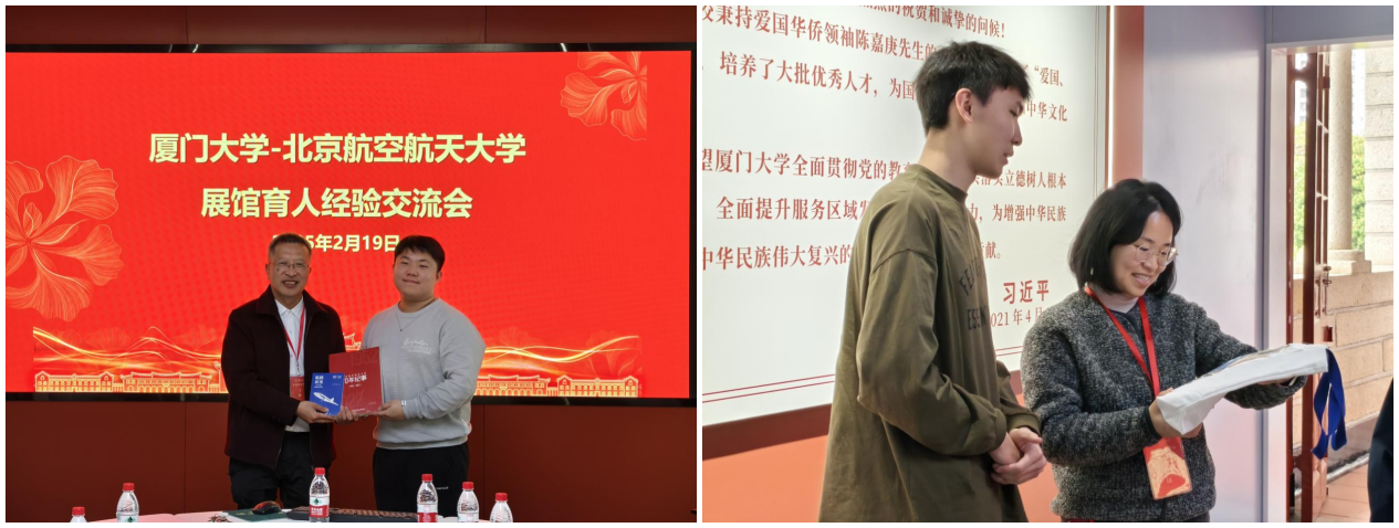 在王老师讲解过后,北航士谔书院辅导员易智恒与王老师就促进两员工谊长存展开交流。易智恒向两位老师送出士谔书院特色文创礼物,希望能借此深化两校的兄弟情谊,让高校间交流更加频繁,产出更大的价值。