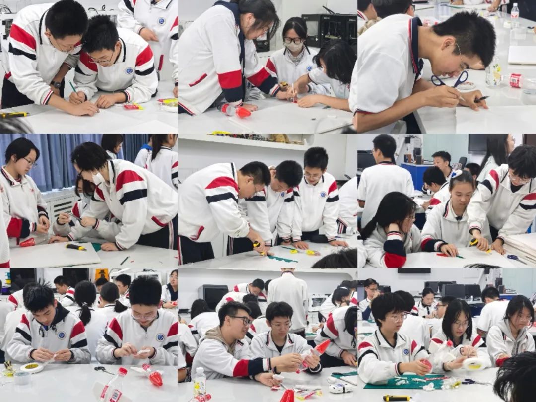 理论讲解结束后,同学们分组开展水火箭制作实践。11个工作台化身为微型航天工坊,同学们全神贯注地投入制作,宣讲团成员和助教穿梭其间,耐心指导,协助同学们完成尾翼设计、水火箭安装及尾翼角度调整等环节,确保每组水火箭都能顺利发射。现场气氛热烈而有序。