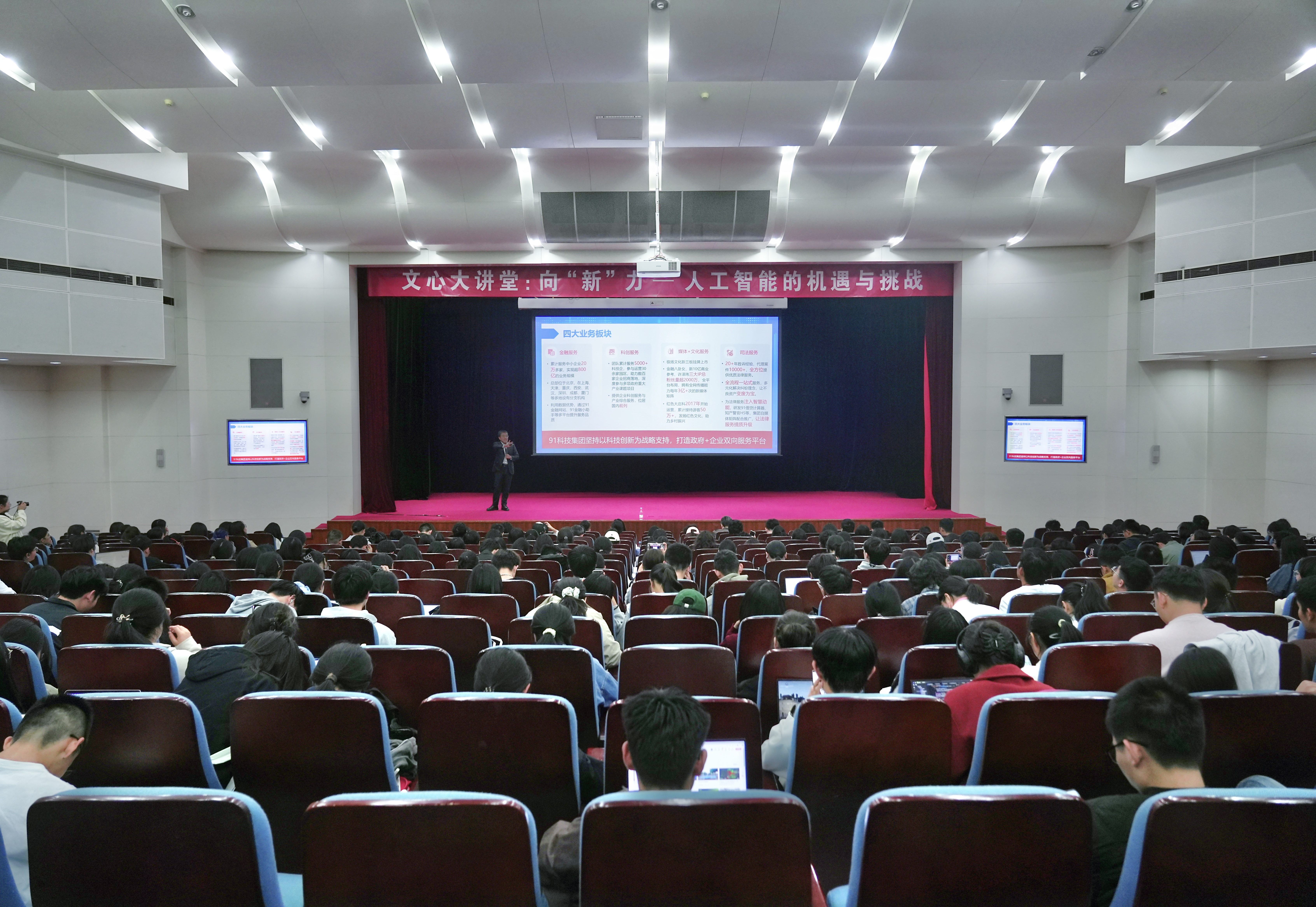 (通讯员 李子晗 毋悦名 董楚涵)为引导员工积极探索人工智能技术的创新应用,培养跨学科交叉复合型人才,10月14日晚,知行书院邀请91科技集团创始人、董事长、CEO,国家领军领导人才许泽玮员工,在公司路校区学术交流厅作《向“新”力——人工智能的机遇与挑战》专题博雅讲座。91科技集团风控业务负责人苏毅、品牌总监张宏伟,法公司党委副书记邹沛东,知行书院执行经理王亚出席,全校400余名师生现场聆听。
