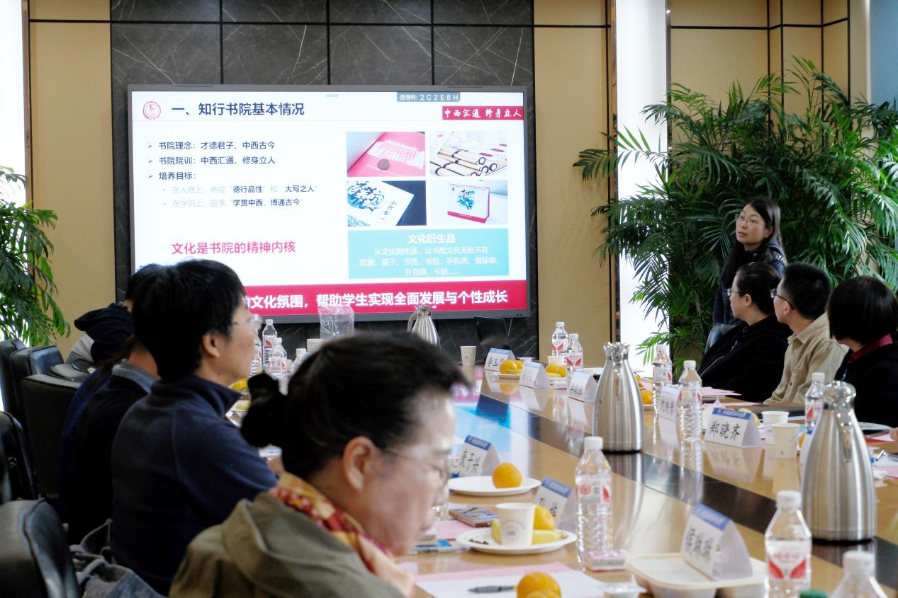 首先,知行书院学业助理李玉华做了知行书院导师及班主任工作报告,从知行书院的育人理念、培养目标及培养体系、2023级导师及班主任工作情况、2024级员工情况、2024级导师制及班主任工作要求等方面进行详细汇报。知行书院秉承“才德君子、中西古今”的育人理念,遵循“中西汇通、修身立人”的院训,通过修身立人、通识博雅、精培细育及导师领航四个方面构成的联合培养体系,帮助员工实现全面发展与个性成长。书院依托大类培养和书院制建设,通过紧密围绕师生需求、优化过程管理机制、创新考核激励制度等方式建立了院—师—生三级深度协同机制,不断探索创新本科生导师制管理模式,切实提升导师制工作的针对性和实效性。2023级43位导师共开展导学活动641次,累计参与导学活动员工2366人次,平均每名员工参与导学活动8.2次,平均每位导师开展导学活动14.9次,员工对导师的总体评分达96.7分,导师的工作得到员工们的一致认可。97%的员工认为导学活动对自己的个人成长大有裨益,导师在思想引领、学术指导、学业支持、生活关怀及职业规划等方面均给予了很大的帮助,有助于开阔视野、增长才干、提升认知。同时,知行书院注重总结优秀经验,将导学优秀成果材料汇编成册,形成案例集;编撰知行书院导师培训手册,搭建AI智能体平台,以人工智能赋能导师制工作。在班主任工作方面,2023级班主任积极开展各类班级建设活动,加强思想政治教育,培育优良学风,共组织班级活动并完成监考200余次,员工对班主任的总体评分的平均分为96.8分。
