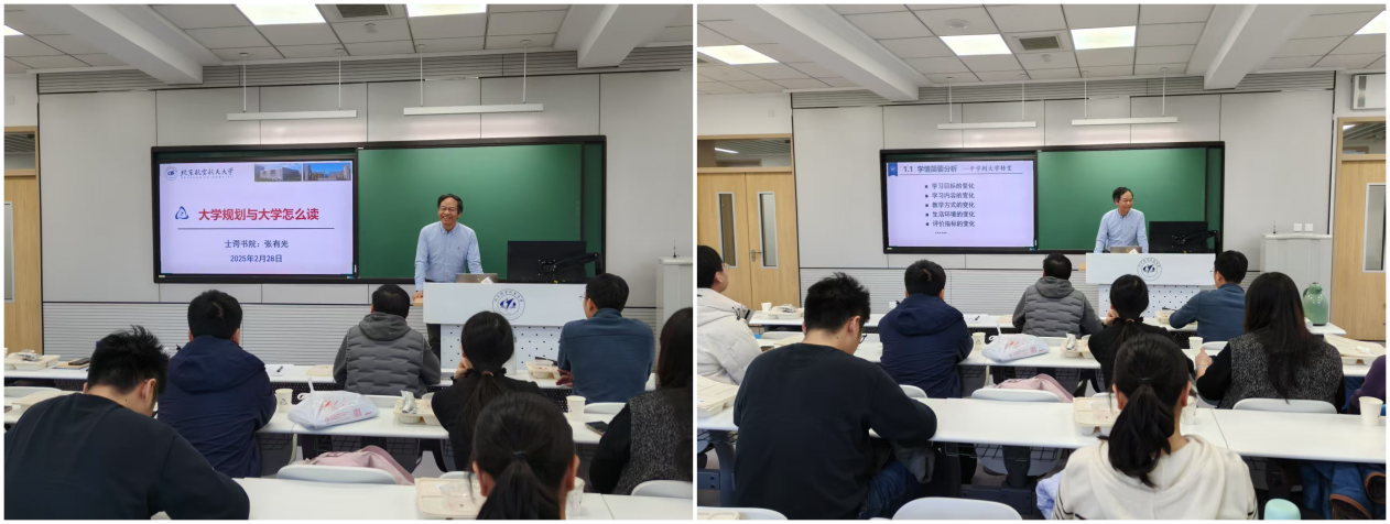 接下来,士谔书院学业总导师张有光作《大学规划与大学怎么读》主题报告,他基于大一新生特点进行学情简要分析,提出作为导师要耐心倾听、敏锐感知,面对员工情绪的不稳定性、发展目标的模糊性等要体现包容。张老师还强调,随着人工智能技术的飞速发展,如何引导信息大类的员工正确对待并使用相关技术也是导师们需要面对的问题。最后,他结合秋季导学读书会与春季大学规划的整体安排,从理论学习与实验实践多角度,以自身为例分享了导学活动的经验。参与老师表示受益匪浅、深受启发。