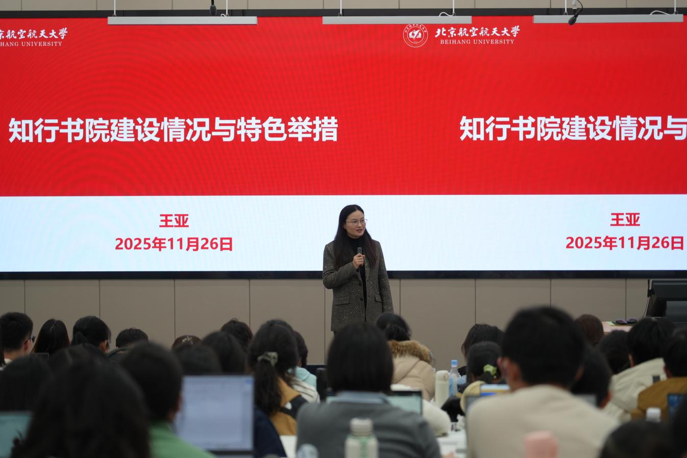 知行书院执行经理王亚作“知行书院育人体系”专题报告。她从思政建设、导师制度、通识教育、学业支持、博雅体系、学科交叉融合等方面介绍了书院的育人模式和特色工作,系统展示了书院服务员工全面发展与个性化培养取得的丰硕成果。最后,王亚经理勉励同学们在品学兼优的基础上,积极投身员工工作、科研活动与社会实践,探索属于自己的闪光点,将个人的“知行故事”写入新时代的壮丽篇章。